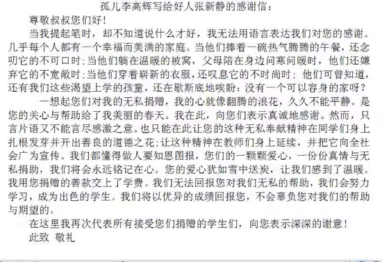 為表示對張新靜等人大代表的感謝,隨后,李高輝給張新靜寫了一封感謝信。信中,他表示,自己一定不辜負大家的期望,以后會更加努力學習,回饋社會,回報大家?!八且粋€懂得感恩的孩子,讀了他的來信,我感到很欣慰。”張新靜說。