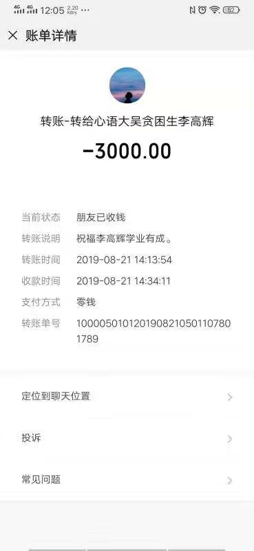 “今后,在學習和生活上無論遇到什么困難,只管給我們說,我們會隨時幫助你解決?!睆埿蚂o在與李高輝聊天中再三叮囑李高輝說。隨后,他通過微信給李高輝轉來3000元學費。