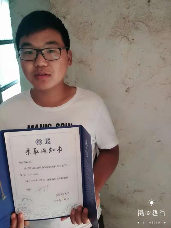 據(jù)了解,李高輝是一個命苦的孩子,很小的時候父親因病去世,母親改嫁,無奈,他只好跟隨年邁多病的爺爺奶奶一起生活,家庭十分拮據(jù)。俗話說,窮人的孩子早當家。李高輝從小學就知道勤奮學習,養(yǎng)成了不懼困難,愛幫助別人的性格,深受師生喜愛。經(jīng)過10多年努力拼搏,2019年高考,他以優(yōu)異的成績被大連海事大學航空學院錄取。