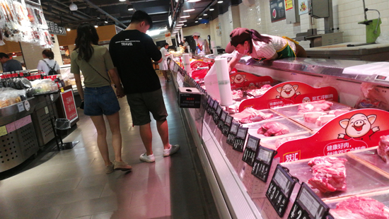 市民在中心城區(qū)一大型超市內(nèi)選購(gòu)豬肉