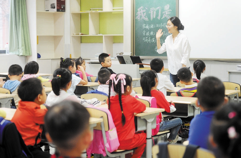 班主任為一年級(jí)新生講解課堂紀(jì)律和行為規(guī)范。