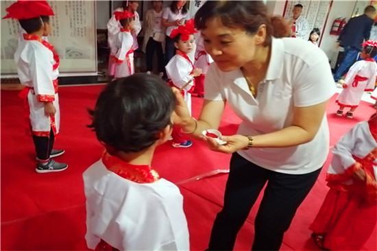活動(dòng)包含“朱砂開智”、誦讀《弟子規(guī)》、“擊鼓明志”、書畫展示、感恩五個(gè)環(huán)節(jié):第一個(gè)環(huán)節(jié)老師為孩子“朱砂開智”。用朱砂為剛剛?cè)雽W(xué)的孩子在額頭正中點(diǎn)上紅痣,又稱之為“開天眼”。寓意著孩子從此心明眼亮,好讀書、讀好書。第二個(gè)環(huán)節(jié)老師帶領(lǐng)大家誦讀《弟子規(guī)》。孩子們?cè)诶蠋熂吧鐓^(qū)工作人員帶領(lǐng)下誦讀國學(xué)經(jīng)典《弟子規(guī)》,一起感受儒家經(jīng)典的道德教化魅力。第三個(gè)環(huán)節(jié)是“擊鼓明志”。擊鼓明志是結(jié)合中國傳統(tǒng)文化,讓孩子們通過擊打中國鼓,以鼓聲的清脆悅耳,來提高孩子的精氣神,激發(fā)孩子們的斗志,給孩子們建立濟(jì)世救人,胸懷天下的抱負(fù),從而也讓孩子們表達(dá)出人生理想,為未來的人生目標(biāo)努力奮斗?!拔议L大想當(dāng)一名醫(yī)生,可以治病救人……我長大想當(dāng)一名消防員,在著火的時(shí)候奔赴火場救人……我長大想當(dāng)一名古箏老師,登上世界舞臺(tái)彈奏好聽的音樂……”孩子們依次擊鼓并說出了人生理想抱負(fù)。第四個(gè)環(huán)節(jié)是書畫展示。繪畫創(chuàng)作讓孩子們靜定心靈,激發(fā)智慧。第五個(gè)環(huán)節(jié)是感恩環(huán)節(jié),感恩老師、感恩父母、感恩天地萬物,以此培養(yǎng)孩子們向善向上的健康思想,增強(qiáng)他們的社會(huì)責(zé)任感,進(jìn)一步引導(dǎo)他們常懷感恩之心。