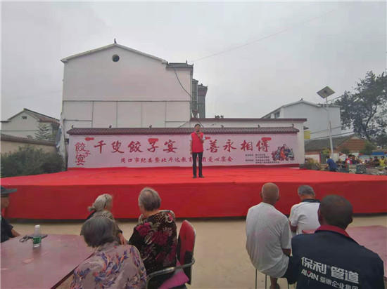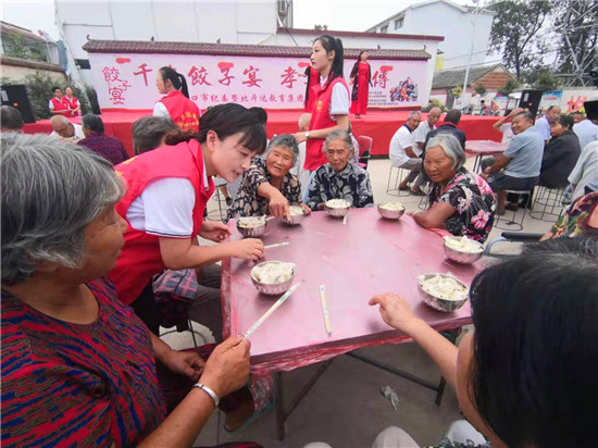 與此同時(shí),在演出現(xiàn)場(chǎng)附近的村委大院內(nèi),由周口市慈孝文化促進(jìn)會(huì)、北斗達(dá)教育集團(tuán)等組成的200多名志愿團(tuán)隊(duì)正忙得不亦樂乎,調(diào)餡、包餃子、下鍋、端盤,兩個(gè)多小時(shí)內(nèi),他們精心包出20000多個(gè)愛心水餃。11時(shí)30分,餃子宴正式開始,老人們一邊吃著水餃一邊觀看者演出,喜笑顏開,呈現(xiàn)出一片相親相敬的溫馨畫面。