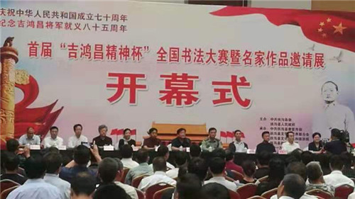 為紀(jì)念抗日民族英雄吉鴻昌將軍就義85周年,大力弘揚(yáng)愛(ài)國(guó)主義精神和中華民族優(yōu)秀傳統(tǒng)文化,9月28日上午,首屆“吉鴻昌精神杯”全國(guó)書(shū)法大賽暨名家作品邀請(qǐng)展在扶溝縣體育館隆重舉行。原廣州軍區(qū)政治部副主任陳大民少將、解放軍報(bào)社原副社長(zhǎng)田仁德少將、解放軍報(bào)社原副總編孫臨平少將、解放軍裝備學(xué)院原副政委孫南京少將、解放軍總后勤部某研究所原所長(zhǎng)楊廷欣少將、吉鴻昌將軍親屬鄭吉安大校,市委常委、周口軍分區(qū)政委孫先振,市政協(xié)副主席張文平,扶溝縣四個(gè)班子領(lǐng)導(dǎo)及副處級(jí)干部等出席開(kāi)幕式。縣委副書(shū)記、政法委書(shū)記詹凱主持儀式。