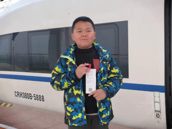 “沒(méi)事,不急,我和媽媽一起等俺爸來(lái)接?!毙∨笥涯弥约旱母哞F票,讓記者給他拍照留下這次快樂(lè)的記憶。
