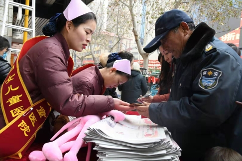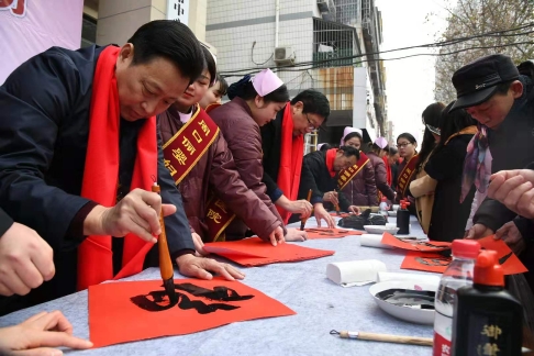 18日上午9時(shí)30分,位于新建街的周口儷嬰婦女兒童醫(yī)院門(mén)前喜氣洋洋,張燈結(jié)彩,熱鬧非凡,儷嬰婦女兒童醫(yī)院邀請(qǐng)市書(shū)協(xié)、川匯區(qū)書(shū)協(xié)的書(shū)法家們,在門(mén)前為“送福送健康暨書(shū)法家義寫(xiě)春聯(lián)”活動(dòng)舉行了簡(jiǎn)短的儀式,隨即活動(dòng)展開(kāi),一邊是儷嬰婦女兒童醫(yī)院的專家們將坐診臺(tái)搬到門(mén)前,細(xì)致地為來(lái)往的居民免費(fèi)量血壓、把脈等義診,一邊擺下10多張桌子和筆墨紙硯,中國(guó)書(shū)協(xié)會(huì)員游保峰,著名書(shū)法家、川匯區(qū)書(shū)協(xié)終身名譽(yù)主席李大慶,書(shū)法家馮干敏、李輝、李國(guó)斌及川匯區(qū)書(shū)協(xié)主席李尊杰,市書(shū)協(xié)副主席劉廣巖,川匯區(qū)書(shū)協(xié)副主席兼秘書(shū)長(zhǎng)杜忠義,副主席曾祥峰、何楠,著名書(shū)法家寇成義等書(shū)法家們,展開(kāi)大紅的紙張,揮毫潑墨,飄著墨香的福字和一對(duì)對(duì)大紅的春聯(lián),帶著新春的祝福,送到居民手里,一波波居民到自己喜愛(ài)的書(shū)法家面前,喜討福字和春聯(lián),開(kāi)心的喜悅洋溢著臉上……