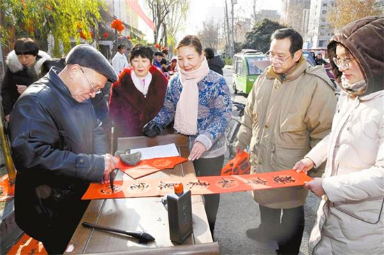 1月19日,由周口市民間文藝家協(xié)會(huì)、川匯區(qū)文聯(lián)聯(lián)合舉辦的“送萬福進(jìn)萬家”義寫春聯(lián)活動(dòng),在周口華威民俗文化博物苑門前舉行。來自市書協(xié)、川匯區(qū)書協(xié)的20多名書法家現(xiàn)場揮毫潑墨,義寫春聯(lián)和“?!弊?,受到市民的一致好評。記者 梁照曾 攝
