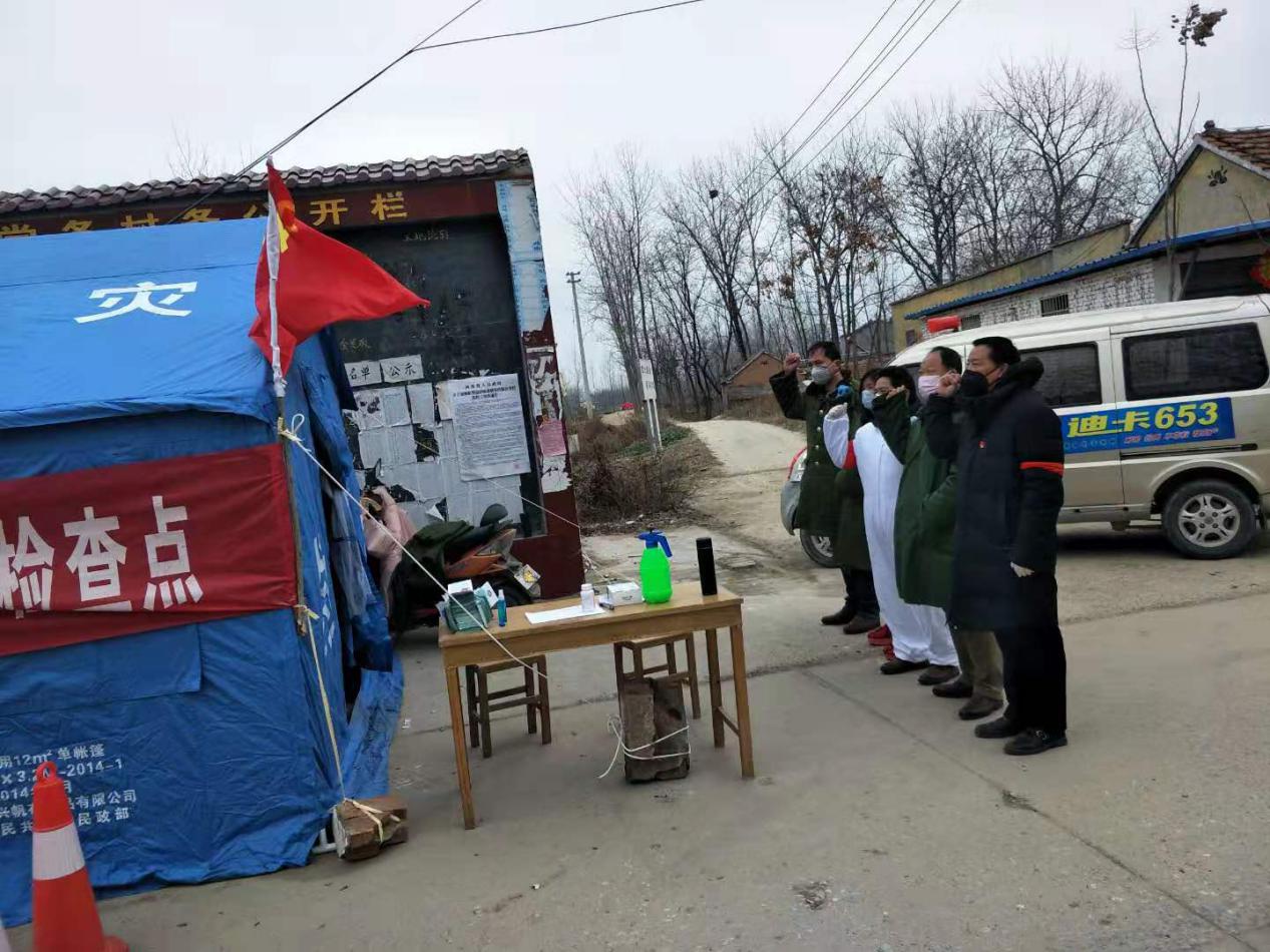 “我莊嚴(yán)宣誓,為維護(hù)人民群眾身體健康及生命安全,全力做好新型冠狀病毒感染的肺炎疫情防控工作,誓死捍衛(wèi)新時(shí)代黨員干部的使命與擔(dān)當(dāng)?!边@是付集鎮(zhèn)黨委副書(shū)記曹懷永帶領(lǐng)張埝卡點(diǎn)宣誓的場(chǎng)景。2月5日,這段感人而又讓人充滿(mǎn)信心的宣誓聲,在付集大地相繼響起,張埝卡點(diǎn)一線(xiàn)臨時(shí)黨支部正式成立。