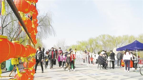 記者沿周口公園主干道向里走看到,路旁的花燈鮮艷奪目,如意湖邊楊柳依依,園內(nèi)迎春花開、玉蘭飄香,滿園春色如期而至。記者發(fā)現(xiàn),游客們?nèi)齼蓛傻?,主要以家庭為單位一起游玩,沒有出現(xiàn)扎堆現(xiàn)象。