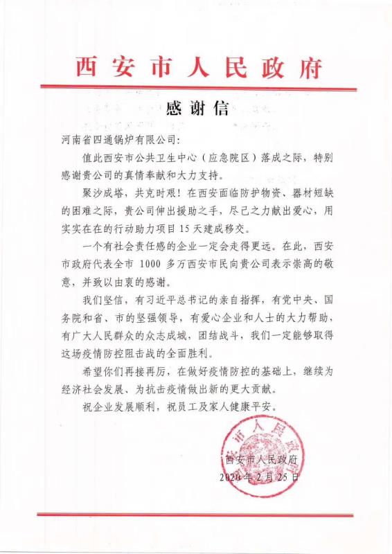“聚沙成塔,共克時(shí)艱!在西安面臨防護(hù)物資、器材短缺的困難之際,貴公司伸出援助之手,盡己之力獻(xiàn)出愛心,在此西安市政府代表全市1000多萬(wàn)西安市民向貴公司表示由衷的感謝”。這是西安市政府對(duì)太康縣拔尖人才、河南省四通鍋爐有限公司總經(jīng)理馮坤的感謝信。一方有難,八方支援。在新聞上了解到武漢新冠肺炎疫情突發(fā)的情況后,他連夜與中國(guó)紅十字會(huì)和武漢紅十字會(huì)取得聯(lián)系,詢問向新建的火神山醫(yī)院捐贈(zèng)醫(yī)用鍋爐和捐款事宜,通過網(wǎng)上銀行將30萬(wàn)善款轉(zhuǎn)入武漢紅十字會(huì)賬戶中。