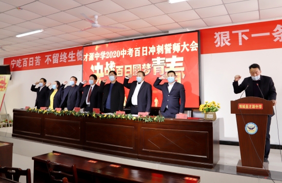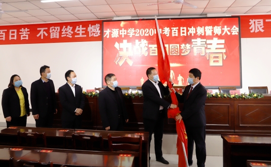誓師大會現(xiàn)場,才源中學校長張醒民向九年級階段負責人授戰(zhàn)旗。師生代表面對直播鏡頭向全體初三師生發(fā)出鏗鏘誓言,號召大家奮勇爭雄,2020年再奪中考全市領(lǐng)先的佳績。誓詞為:凌志擎天,豪氣滿懷;天道酬勤,樂戰(zhàn)不??;意堅心恒,信念常在;以我雄心,征戰(zhàn)未來;沖刺百日,只為無悔青春;人生綻放,定是風雨兼程;今日苦讀書厲兵秣馬,明朝進重點吐氣揚眉。