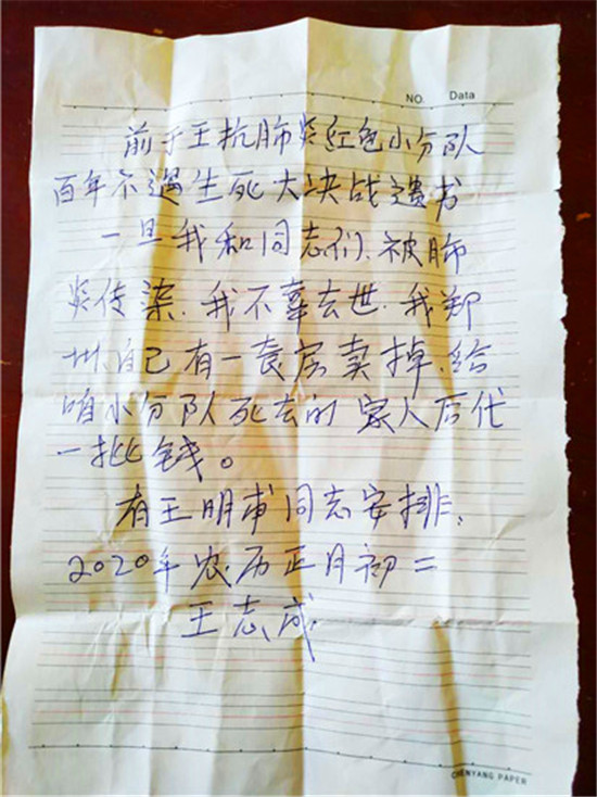 在新冠肺炎疫情肆虐、全民阻擊的戰(zhàn)斗中,全社會(huì)眾志成城譜寫(xiě)了一部蕩氣回腸的抗疫英雄史詩(shī),在這部由普通人共同譜寫(xiě)的民族史詩(shī)中,有太多讓人淚奔而蕩氣回腸的故事,西華縣奉母鎮(zhèn)南于王村的12名老退伍軍人及軍人家屬自發(fā)組織的紅色抗疫小分隊(duì),不顧生死阻擊疫情守護(hù)四千鄉(xiāng)親,風(fēng)聲鶴唳的疫情下,發(fā)起人王成志悲壯地寫(xiě)下生死遺書(shū),交給隊(duì)友,囑咐道“我不幸去世,將我鄭州的房產(chǎn)賣(mài)掉分給小分隊(duì)死去的家人后代”,保家衛(wèi)國(guó),壯士斷腕,驚天地泣鬼神。近日,市博物館征集抗疫見(jiàn)證物,引出這個(gè)村莊的特殊群體的抗疫故事。