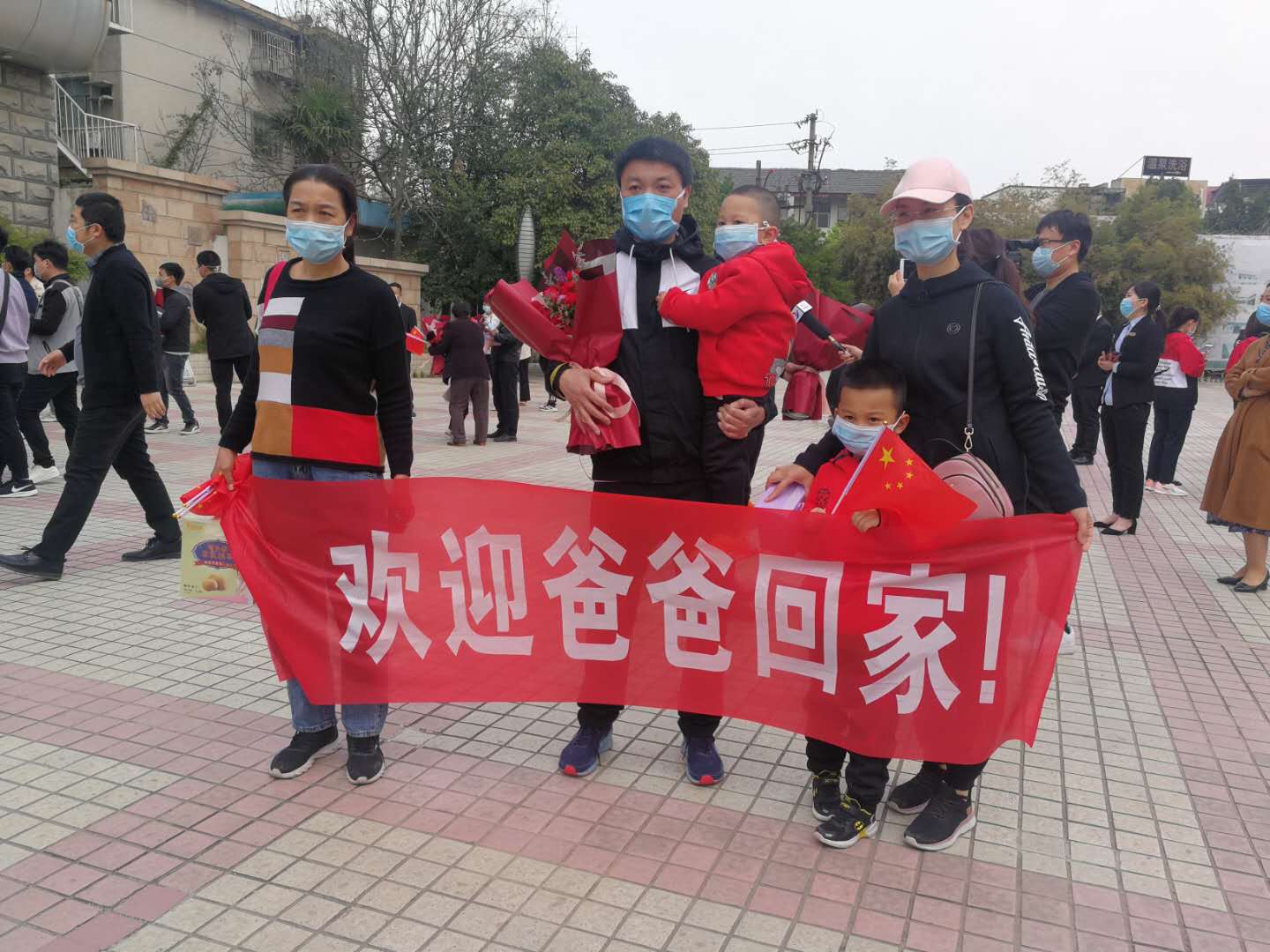 “歡迎爸爸回家”、“歡迎回家” 親人們、同事們、朋友們和自發(fā)趕來(lái)的市民早早守候在隔離休整點(diǎn)門口,等著迎接英雄回家。一束束鮮花、一條條橫幅都在向凱旋而來(lái)的勇士們表達(dá)著敬意和思念。