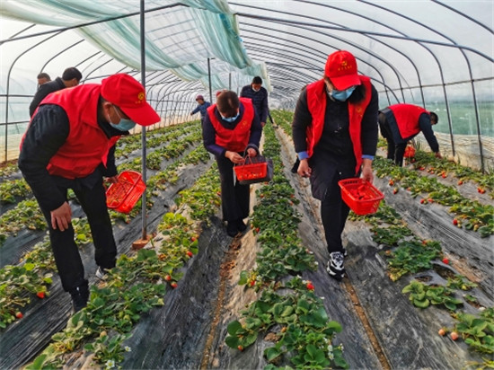 黨員志愿者到幫扶村向過往群眾宣傳普及新型冠狀肺炎防治知識(shí),發(fā)放新型冠狀病毒感染防控指南,并幫助村民采摘、銷售因疫情而滯銷的草莓,深受當(dāng)?shù)厝罕姺Q贊。