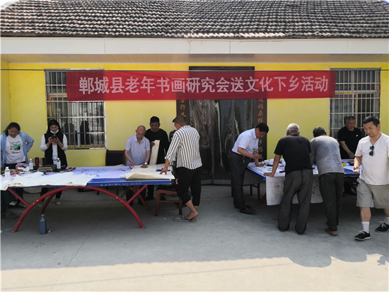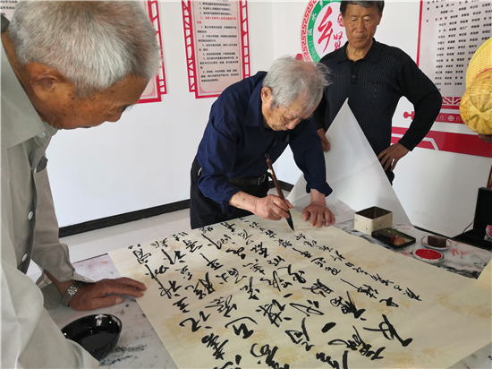 曾慶祥、李宏亮、閆子明、朱好明、單建勛、劉祖祥等9名老年書畫名家一下車,顧不上休息,就紛紛潑墨揮毫,現(xiàn)場為群眾義寫義畫486幅,為村民們獻(xiàn)上一場難得一遇的文化盛宴。雖然天氣炎熱,但是書畫家不辭辛苦,就連已經(jīng)89歲的李宏亮老師中間也不曾休息片刻,直到中午12:30才收筆,熱火朝天的工作激情贏得了干部群眾的一致好評(píng),也都豎起大拇指為他們點(diǎn)贊!