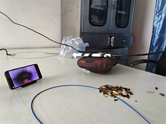 記者看到徐醫(yī)生自制的呼吸內(nèi)鏡,胸部是用一個家用電動按摩枕代替的,用來能模擬人的胸部呼吸起伏;按摩枕上固定了兩個用打印紙卷成的小紙筒,用來代替氣管;屏幕是用手機代替的,用WIFI和氣管鏡鏈接,影像可以通過手機屏幕看到;內(nèi)鏡手柄是徐醫(yī)生用膠泥結(jié)合真實設(shè)備形狀、重量捏制而成的。當(dāng)著記者的面,徐醫(yī)生把一小半瓜子皮放入模擬人體氣管的紙筒,在手機屏幕的導(dǎo)航下通過氣管鏡到達(dá)異物所在位置,熟練地用異物鉗夾出異物。