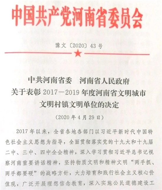 近日,省委、省政府下發(fā)《關(guān)于表彰2017—2019年度河南省文明城市文明村鎮(zhèn)文明單位的決定》(豫文〔2020〕43號(hào)),鄲城縣婦幼保健院名列其中,榮獲“河南省文明單位”榮譽(yù)稱號(hào)。這是我院自1987年首次被授予“河南省文明單位”稱號(hào)以來,連續(xù)第33年保持這項(xiàng)榮譽(yù)。