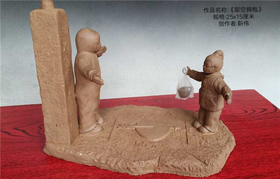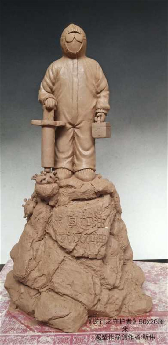 所捐《逆行之守護(hù)者》泥塑作品,高50厘米,寬26厘米,描述全副武裝的醫(yī)護(hù)工作者一手握針管殺死病毒,一手提藥箱救人,謳歌了疫情中逆行的醫(yī)護(hù)工作者不畏犧牲、與新冠病毒搏斗,冒死救治病毒感染者的偉大精神。《隔空擁抱》是講述我市扶溝縣人民醫(yī)院抗疫故事,疫情期間奮戰(zhàn)在抗疫一線的劉海燕醫(yī)生和為自己送年夜飯的女孩隔空擁抱的感人場(chǎng)景,讓無數(shù)人熱淚盈眶。