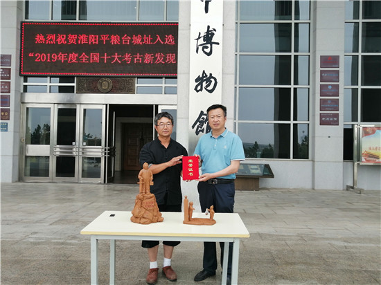 6月12日,在2020年“文化和自然遺產(chǎn)日”即將來臨之際,淮陽區(qū)市級(jí)非物質(zhì)文化傳承人靳偉向市博物館捐贈(zèng)“抗疫”泥塑作品《逆行之守護(hù)者》《隔空擁抱》,以表達(dá)藝術(shù)家對(duì)新冠肺炎疫情期間全國(guó)醫(yī)務(wù)人員無私精神的敬意。周建山館長(zhǎng)向靳偉頒發(fā)榮譽(yù)證書。