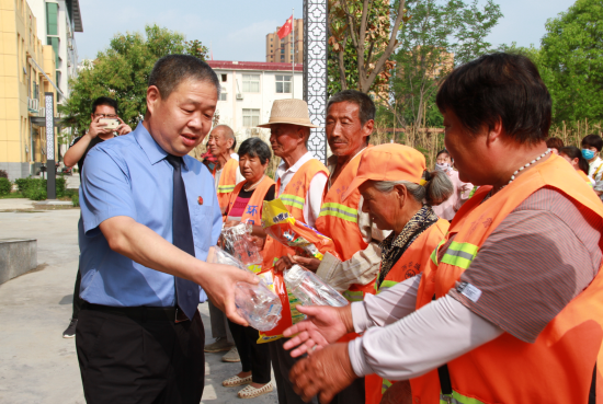 6月18日下午,西華縣檢察院黨組書記、檢察長鄭清朝帶領該院志愿者服務隊開展慰問環(huán)衛(wèi)工人志愿者活動,為775名環(huán)衛(wèi)工人送去毛巾、洗衣粉、香皂、水杯、礦泉水等價值近3萬元的慰問品,以此表達對普通勞動者最真摯的關懷。
