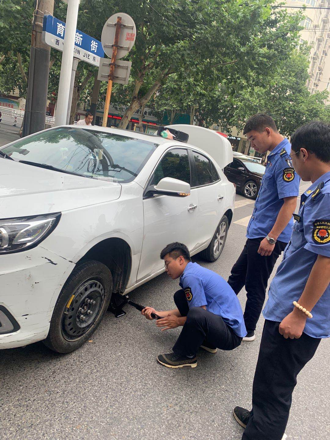 “我?guī)Ш⒆踊丶业穆飞?,沒(méi)想到汽車突然爆胎,天太熱了,孩子還小,一直哭鬧,我完全不知道該怎么辦。”女車主著急地向城管隊(duì)員講述了遇到的突發(fā)狀況。了解情況后,周自新、龐博、康棟棟、宋俊峰等隊(duì)員對(duì)女車主安撫后,在車前后設(shè)置安全警示、疏通交通。得知車上有備胎后,隊(duì)員們找出工具和備胎,決定更換輪胎。十分鐘后,車胎更換完畢,女車主十分感動(dòng),連聲感謝。