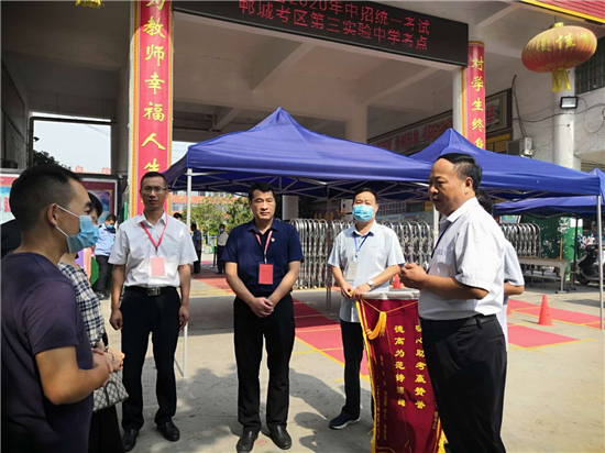 “該中招考試了,俺孩子錦博卻在7月8日騎電動(dòng)車摔斷了腿,這該咋辦,我和孩子他爸都愁壞了,沒(méi)想到我們一家在7月14號(hào)下午來(lái)第三實(shí)驗(yàn)中學(xué)看考場(chǎng)時(shí)候,第三實(shí)驗(yàn)中學(xué)考點(diǎn)主考付曄和第三實(shí)驗(yàn)中學(xué)校長(zhǎng)孟杰發(fā)現(xiàn)了我們的情況后,對(duì)我們說(shuō):“你們放心,孩子考試的事情就包在我們身上。”立即安排學(xué)校李蘭君老師、張子江老師專門(mén)護(hù)送孩子進(jìn)出考場(chǎng),并安撫孩子專心考試,不要有什么心理負(fù)擔(dān)。聽(tīng)孩子說(shuō)這幾場(chǎng)考試,李蘭君老師和張子江老師都是背著孩子上下樓、去廁所、出考場(chǎng),對(duì)于你們的幫助,我真不知道該說(shuō)什么好,真的太感謝你們了,謝謝!謝謝!中考考生劉錦博媽媽眼含淚花動(dòng)情地說(shuō),并把一面寫(xiě)著“暖心助考贏贊譽(yù),德高為范鑄師魂”的錦旗交給鄲城縣教體局黨組書(shū)記、局長(zhǎng)羅明黨手中。
