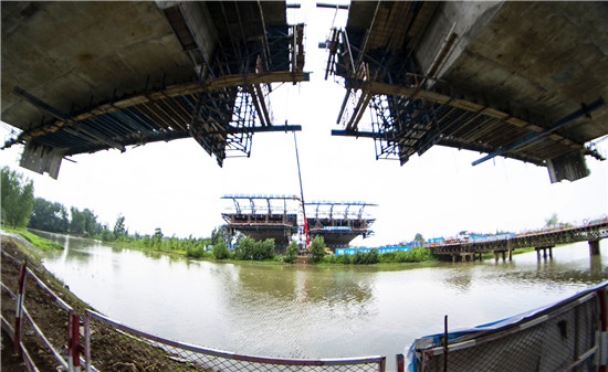周口北環(huán)跨賈魯河大橋是我市在建重點(diǎn)工程,全長(zhǎng)904米,其中主橋總長(zhǎng)286米,共3跨,采用懸澆法施工。7月16日中午,記者在工地看到,經(jīng)過(guò)一年多的施工,工程完成80%左右,為了保障工期和質(zhì)量,工人們冒著酷暑,在跨河的兩列橋墩上,忙碌著澆鑄施工,隨著澆鑄橋體的延伸,預(yù)計(jì)年底橋體完成合攏。