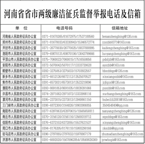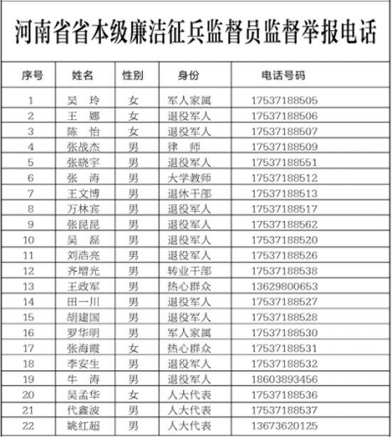 為扎實(shí)做好河南省廉潔征兵工作,切實(shí)維護(hù)廣大應(yīng)征青年合法權(quán)益,確保為國防和軍隊(duì)建設(shè)輸送優(yōu)質(zhì)兵員,現(xiàn)將省本級廉潔征兵監(jiān)督員和省市兩級廉潔征兵監(jiān)督舉報(bào)方式予以公示,歡迎社會各界對征兵工作予以監(jiān)督。征兵工作政策法規(guī)請關(guān)注“河南征兵”微信公眾號。