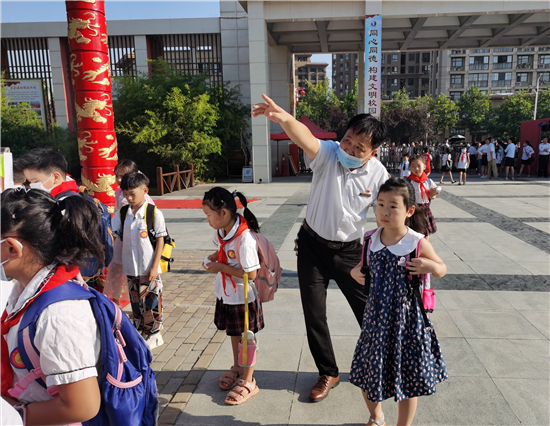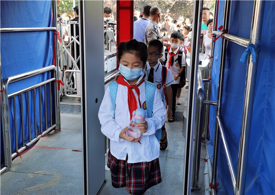 9月7日早上,周口市文昌小學(xué)的學(xué)生有序排隊(duì)測量體溫后進(jìn)入學(xué)校。據(jù)文昌小學(xué)校長介紹,全市中小學(xué)實(shí)行錯(cuò)峰開學(xué)。今天是小學(xué)開學(xué)時(shí)間,文昌小學(xué)學(xué)生每個(gè)年級(jí)實(shí)行錯(cuò)時(shí)上下學(xué),學(xué)生入校要測體溫,并為一年級(jí)新生舉辦了主題為“夢從這里啟航”的“迎新儀式”。