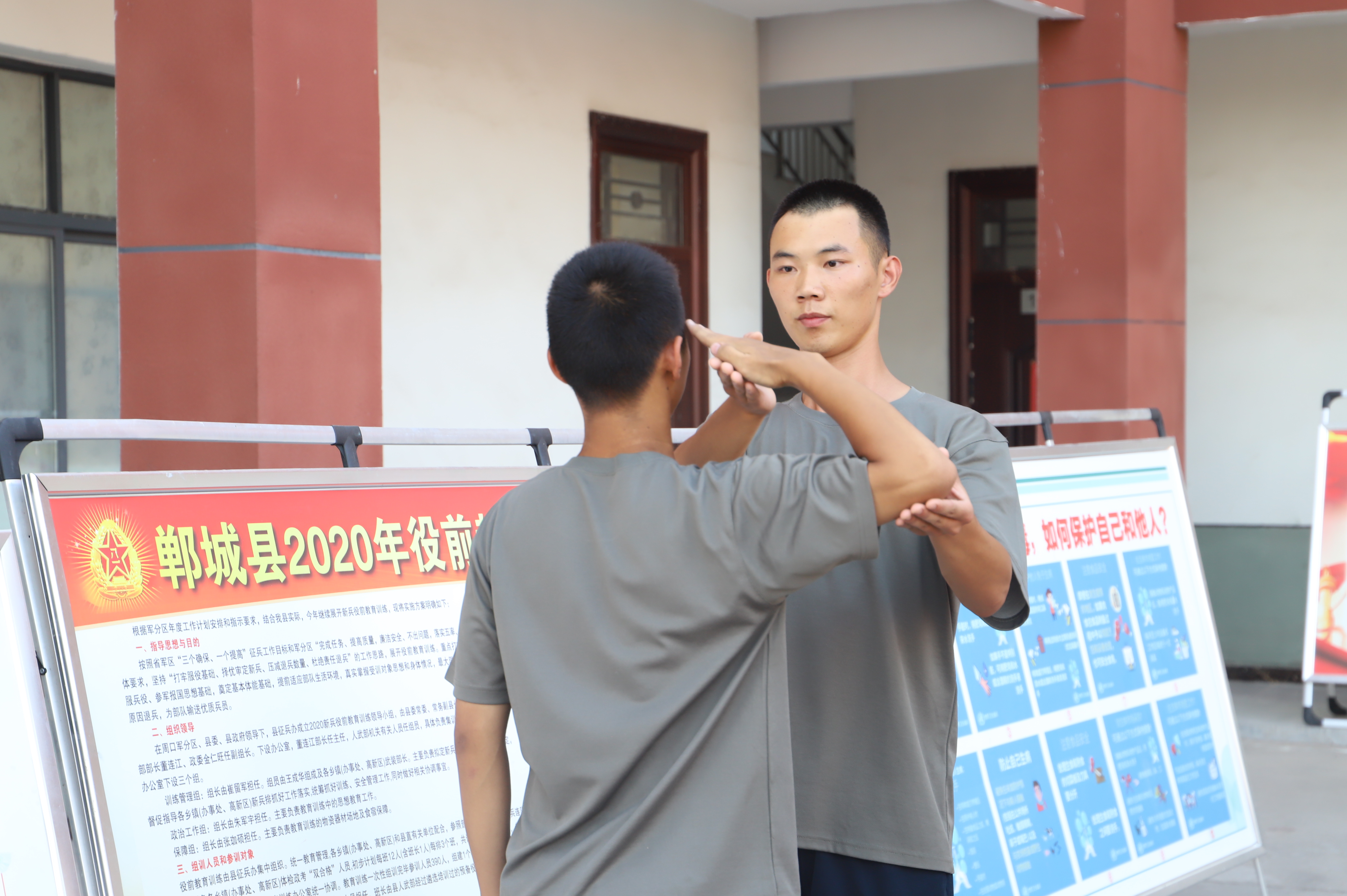 蛙跳、鴨子步、俯臥撐、側(cè)身敬禮、蹲起……盡管汗流浹背,兩位“老兵”在新兵面前沒(méi)有一絲疲倦,充分展現(xiàn)了軍人的風(fēng)采,也流露出了兩位青年向往軍營(yíng)的堅(jiān)定意志。