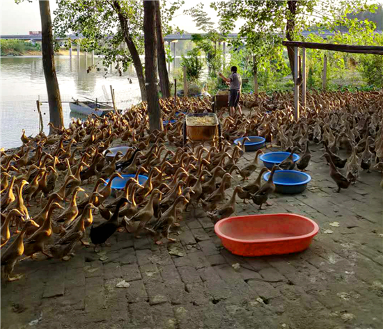 為了擴大變蛋原料來源,她與當?shù)丶巴獾囟嗉茵B(yǎng)雞企業(yè)簽訂訂單協(xié)議,滿足自己加工變蛋需要。為了滿足鴨蛋貨源,她在潁河灣一個支流處新建一個養(yǎng)鴨基地,目前養(yǎng)鴨5000余只,日產(chǎn)鴨蛋5000枚,基本滿足當前加工咸鴨蛋需要。