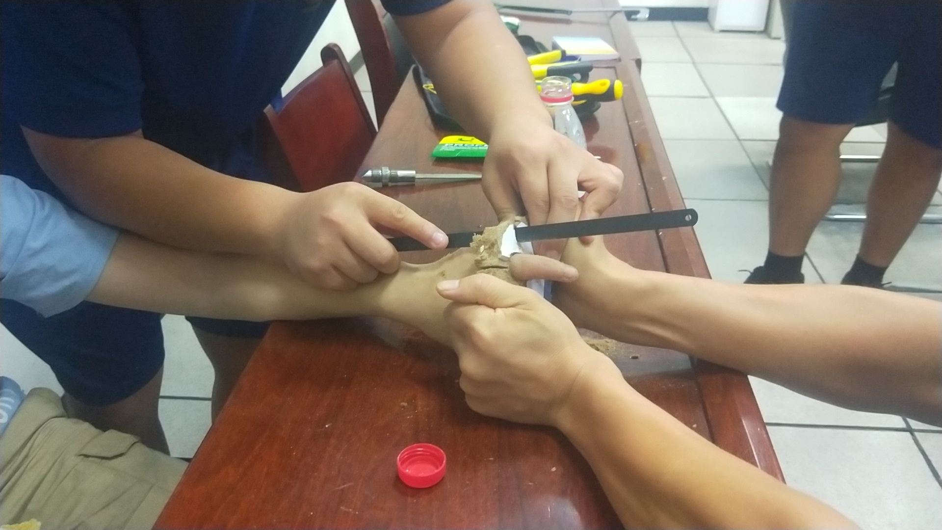 看到救援人員,小男孩十分害羞,有點不好意思?!拔铱醋雷由嫌袀€孔,就是想看看手指能不能伸進去,結(jié)果就拔不出來了?!本仍藛T經(jīng)觀察發(fā)現(xiàn),小男孩左手無名指被卡在課桌木板上的小孔里,木板已被裁下,木板材質(zhì)為鋸末壓縮板,此時小男孩手指被卡部位周圍已發(fā)生腫脹必須馬上處理。救援人員利用鋼鋸將木板一點點鋸開,然后又用鉗子用力將木板夾開,經(jīng)過3分鐘救援,成功將禁錮小男孩手指的木板摘除??吹侥景灞粡氖稚先∠拢泻㈤L長地舒了口氣。