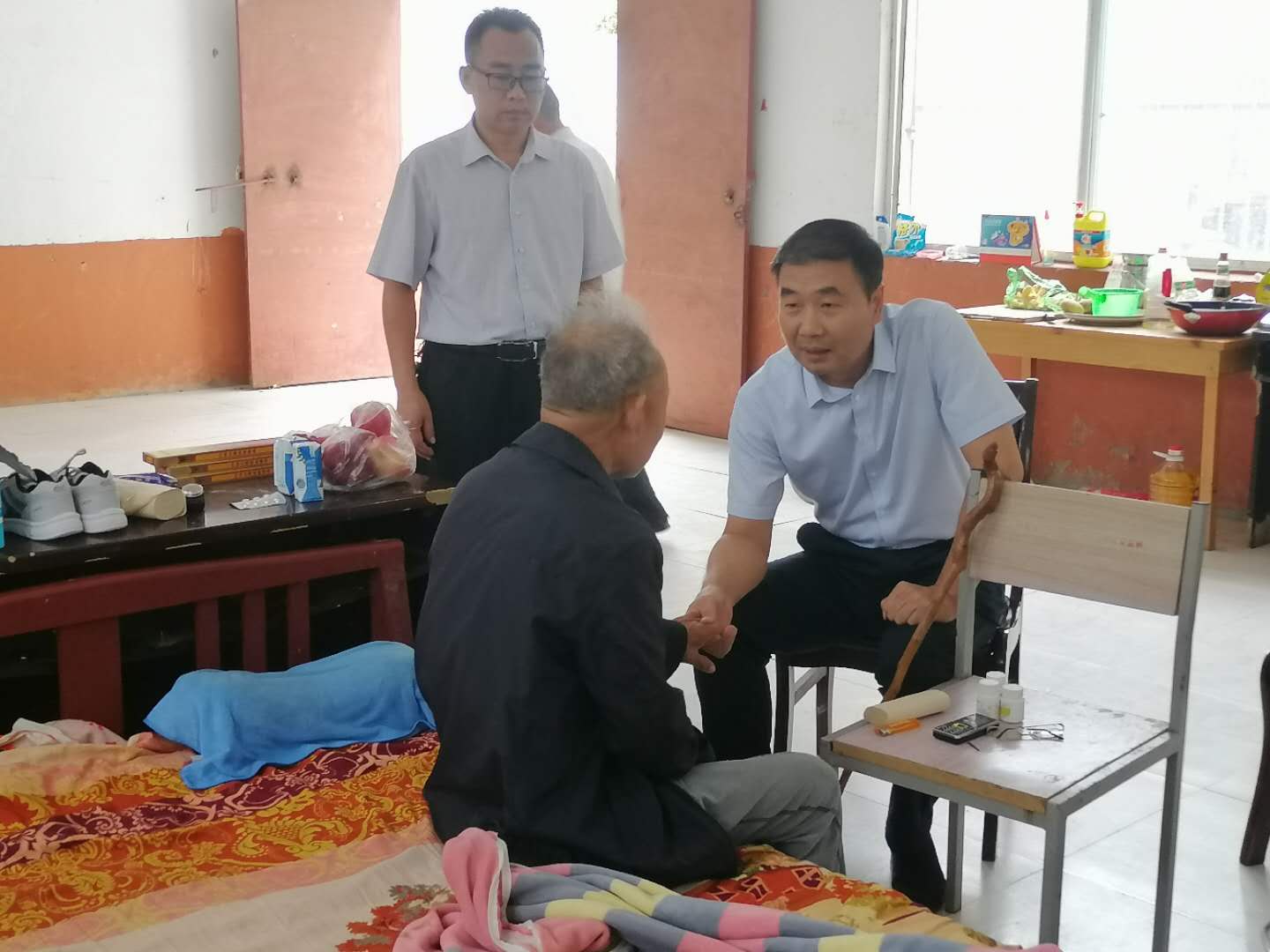 當日16時,在三李村村室旁邊的一間房屋內,孔陽一見到坐在床頭的張殿運,就緊緊拉住他的手,詳細詢問老人吃的什么藥、效果怎么樣、身體恢復得如何?他叮囑老人:“你保重好身體就是對兒子工作的支持,也是對商水縣扶貧工作的支持?!睆埖钸\說話困難,表達不清,嘴唇顫抖半天也說不出一句話,只是緊緊地握住孔陽的手。得知老人在鹿邑縣宋河鎮(zhèn)農村當村干部30多年,孔陽稱贊他為黨為民工作一輩子,是好樣的。