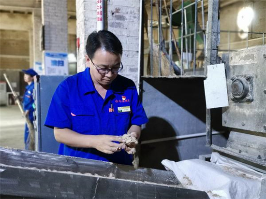 9月17日上午,大河網(wǎng)記者在河南仰韶酒業(yè)有限公司的制曲車間看到,曲磚生產(chǎn)線正在緊張生產(chǎn),張振科抓起傳送帶上的原料進(jìn)行擠壓,查看原料的水分度和粉碎度。和生產(chǎn)線的工人交流后,張振科又和徒弟來到曲庫(kù),分別拿起半塊曲磚,放到鼻子下,深深吸氣,嗅聞曲磚的曲香。