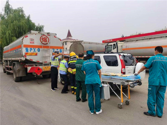 當(dāng)日上午10時(shí),商水交警大隊(duì)指揮中心接到報(bào)警:在商水縣興商大道與陳勝大道交叉口西、湯莊油庫處,一輛轎車與一輛?;饭捃囎肺蚕嘧玻9摅w損壞,危化品泄露起火,轎車駕駛室變形,駕駛?cè)吮焕к噧?nèi),如不及時(shí)救援,駕駛?cè)擞猩kU(xiǎn),另外因事故現(xiàn)場臨近湯莊油庫,如不及時(shí)處置可能發(fā)生爆炸,后果不堪設(shè)想。