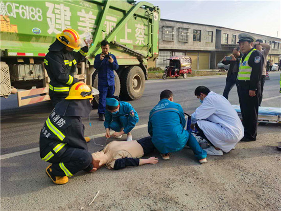45分鐘的演練,從接警開(kāi)始到應(yīng)急救援處置,周口市商水縣公安局交警大隊(duì)9名民警和輔警、駐馬店市上蔡縣公安局交警大隊(duì)16名民警和輔警,會(huì)同上蔡消防6名救援人員、4名醫(yī)護(hù)人員和4名車(chē)輛拖移人員等,積極協(xié)作,密切配合,將事故中被困車(chē)內(nèi)的駕駛?cè)撕褪軅藛T迅速救出并實(shí)施包扎處置,及時(shí)送上急救車(chē)迅速前往醫(yī)院搶救。而后,商水縣交警大隊(duì)事故處理民警和上蔡縣交警大隊(duì)民警配合完成事故現(xiàn)場(chǎng)勘查與證據(jù)固定,快速拖移事故車(chē)輛,恢復(fù)交通,杜絕了二次事故。