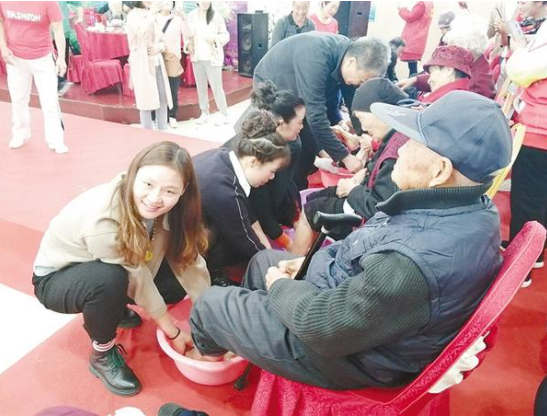 重陽節(jié)當天,周口市總工會、周口市教體局、川匯區(qū)供銷社在鴻運酒店舉辦“九九重陽節(jié) 濃濃敬老情”孝老愛親活動,邀請200多名社區(qū)老年人及家屬參加。活動現(xiàn)場,家屬為老人進行了洗腳(如圖),主辦方安排了精彩的文藝演出,博得觀眾陣陣掌聲,讓社區(qū)老人過了一個歡樂祥和的重陽節(jié)。