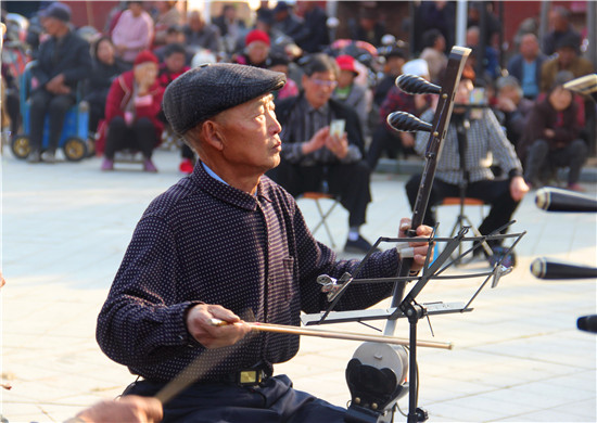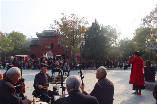 11月10日,戲迷朋友在商水縣郝崗鎮(zhèn)北社村千年古塔旁表演戲曲節(jié)目。初冬時節(jié),暖陽普照,壽圣寺古塔附近的戲迷和樂器愛好者自發(fā)來到千年古塔旁表演戲曲節(jié)目,為當?shù)厝罕娝蜕暇实奈幕蟛?,進一步活躍了農(nóng)村文化生活。①15周口日報·周道客戶端記者付永奇 通訊員 呂耀光 攝