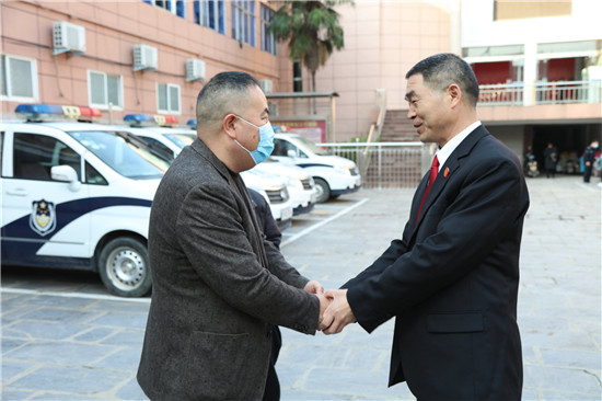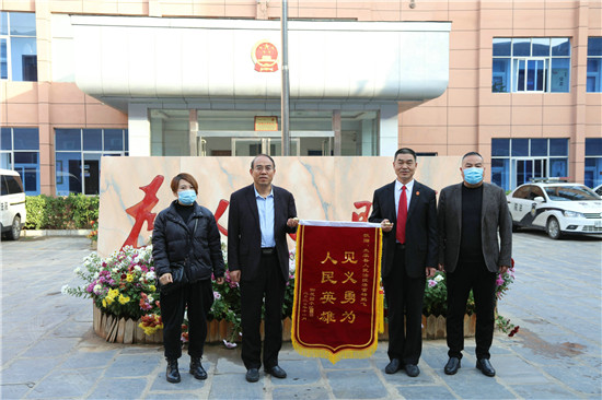 11月19日,侯某某夫婦將一面寫有“見義勇為 人民英雄”的錦旗送到太康縣人民法院法官楊鵬飛手中,表達一家人對楊鵬飛救助落水女兒的感激之情。