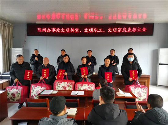 疫情防控辦公室、黨政辦公室獲得“文明科室”稱號;王志國、史路路獲得“文明職工”稱號;鄒亮家庭、武志強家庭等6個家庭獲得“文明家庭”稱號。大會為獲獎集體和個人頒發(fā)了獎牌、榮譽證書和獎品。取得榮譽的先進集體和個人,集中展示了陳州辦事處的文明形象和干部職工的職業(yè)道德、家庭美德和個人品德,為文明單位創(chuàng)建增添光彩。