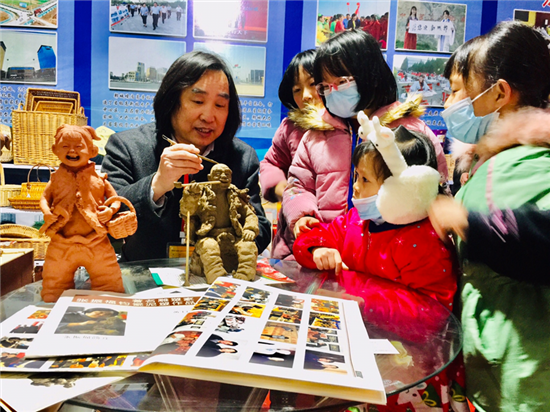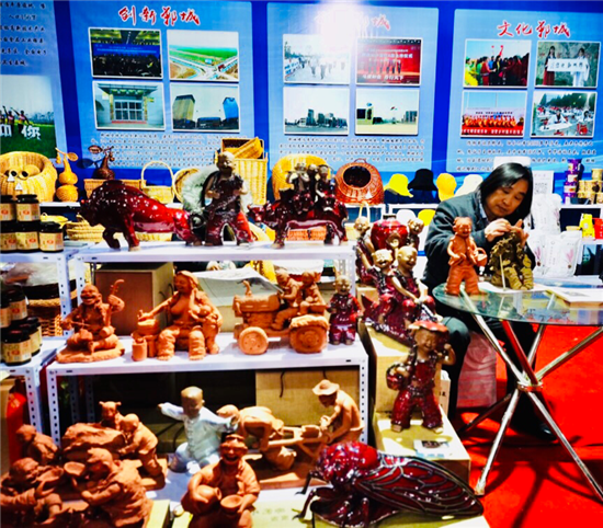 鄲城縣泥塑藝術(shù)大師張振福應(yīng)邀攜48件作品參加大會,成為展會的一大亮點(diǎn)。其中原生態(tài)泥塑作品18件,有《磨豆汁》《耕耘》《酒逢知己》《二胡曲》等,鈞瓷泥塑作品20件,有《大金蟬》《年年有余》《豫東娃》《瑞牛迎春》等。張振福的作品表現(xiàn)豫東的鄉(xiāng)村人物,作品突出個(gè)性,憨態(tài)可掬,深受觀眾的喜愛,大家紛紛駐足觀看。