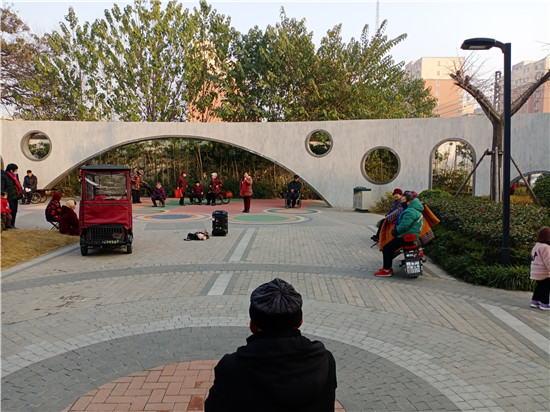 12月10日,雖然氣溫不高,可是天空暖陽高照,在周口中心城區(qū)建安路上的一個街頭游園內(nèi),不僅聚集了前來休閑的老人,還有不少戲迷朋友,她們手拿話筒,唱起戲曲節(jié)目,讓人樂在其中。記者 張洪濤 攝