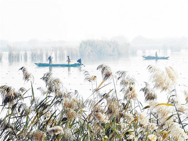 12月14日,兩艘冬捕的漁船在淮陽區(qū)龍湖布網捕魚。湖岸蘆葦搖曳,遠處薄霧蒙蒙,景色迷人,恰似水墨丹青。 記者 杜欣 攝
