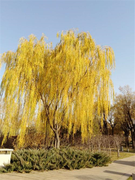 冬日暖陽照三川,垂柳更換鵝黃衫。無盡情思春可寄,千條萬條隨風(fēng)翩。12月15日,我市天氣晴朗,路旁一排排垂柳隨風(fēng)搖曳,像一個個舞動的小精靈,又像一團團鵝黃色的薄霧,如此美不勝收的風(fēng)景就像一幅畫,令人忍不住駐足欣賞。