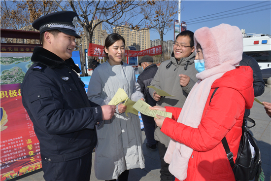 為迎接第35個(gè)“110宣傳日”的到來(lái),1月9日,扶溝縣公安局組織民警在人民公園廣場(chǎng)開展“一心為民110,砥礪奮進(jìn)新征程”為主題宣傳活動(dòng)。民警通過(guò)現(xiàn)場(chǎng)發(fā)放宣傳資料、法律宣傳、警民互動(dòng)等方式介紹110社會(huì)聯(lián)動(dòng)常識(shí),教群眾如何提升冬季安全防范知識(shí),進(jìn)一步密切警民關(guān)系。圖為民警向過(guò)往群眾發(fā)放宣傳資料。