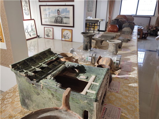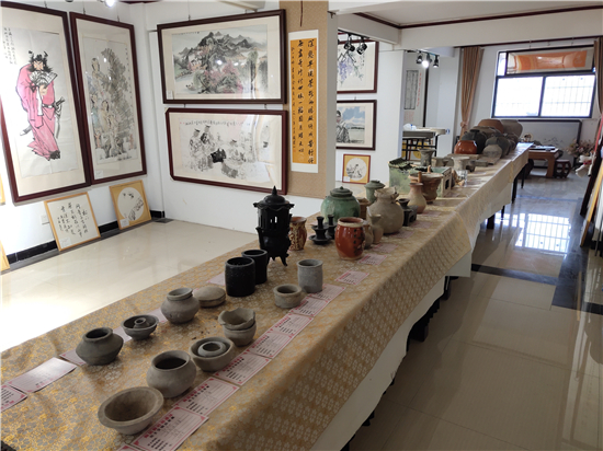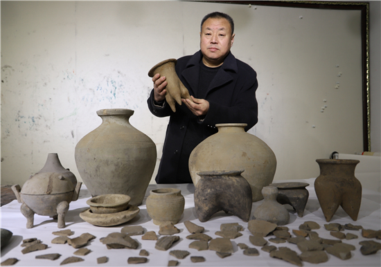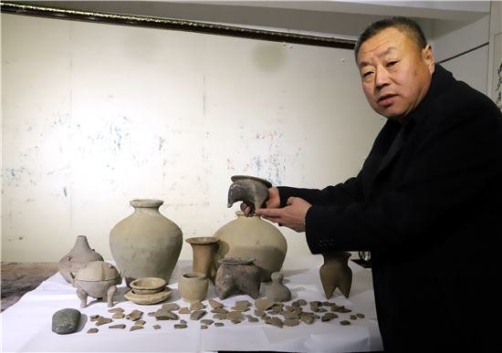 三足燉肉的陶鬲、圓形擦粉的粉盒、前方后圓的灶臺、帶孔過濾的茶罐、廣口大肚的糧罐、象形浮雕的方磚、雙耳大肚的水壺……1月31日,鄲城縣文聯(lián)副主席、收藏家協(xié)會會長閆振宇打開自己的“博物館”,將多年來在鄲城縣丁村鄉(xiāng)陶店村出土并收藏的數(shù)十件陶器向記者展示,以此進(jìn)一步證明陶店遺址是龍山文化新時期石器遺址,疑為中國灰陶最早生產(chǎn)地,中國陶器之鄉(xiāng)。