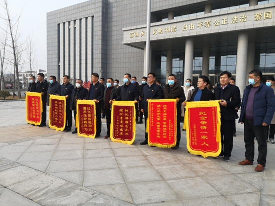 2月4日下午,淮陽區(qū)康森木業(yè)有限公司、周口裕彩科技研發(fā)有限公司等6家企業(yè)代表為區(qū)優(yōu)化營商環(huán)境專項(xiàng)治理工作組送來了6面錦旗和大量防疫物資,向工作組表達(dá)感激之情,對(duì)工作組人員高效快捷的工作給予高度贊揚(yáng)。
