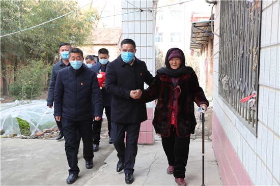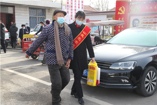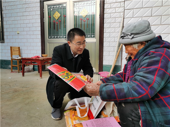 在鄭家集鄉(xiāng)韓樓村,縣農(nóng)商銀行鄭家集支行行長武繼龍帶領(lǐng)員工來到92歲韓老漢的家中,看到韓老漢由于身體原因只能靠拐棍佝僂著背站著,武繼龍緊忙彎腰俯下身說:“大爺,快過年了,我們來看看您,提前給您拜個早年!”“真的是太感謝恁了,這么冷的天,還讓你們來送到家里面?!表n老漢激動地說。