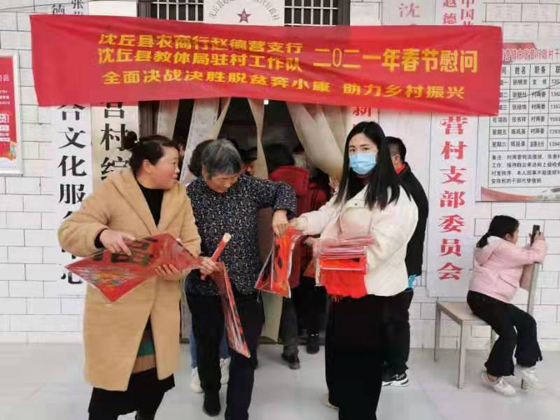 村室外邊,縣教體局駐村工作隊(duì)長(zhǎng)李小兵、村干部不停地把一幅幅火紅的春聯(lián)遞到村民的手上,并和大家互道祝福:“鄉(xiāng)親們,新年好,牛年好運(yùn)。”