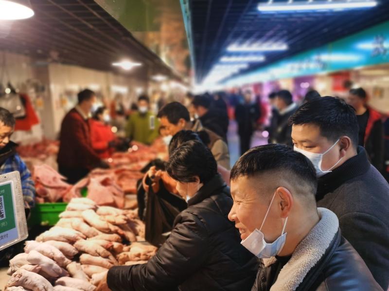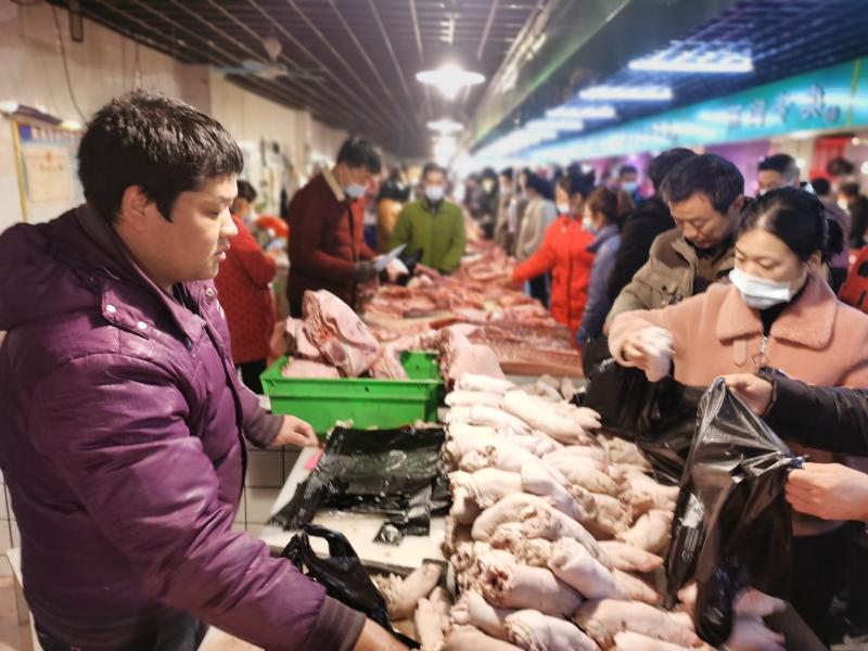 2月10日一大早,位于周口市的最大的黃淮農(nóng)貿(mào)市場(chǎng)里熙熙攘攘,熱鬧豐常,行人小心翼翼地從來(lái)往的各式貨車(chē)間穿過(guò),客商們被格外熱鬧的攤位吸引,駐足詢價(jià)、了解行情。圖為熱鬧的肉類(lèi)銷(xiāo)售區(qū)域內(nèi)市民在選購(gòu)。